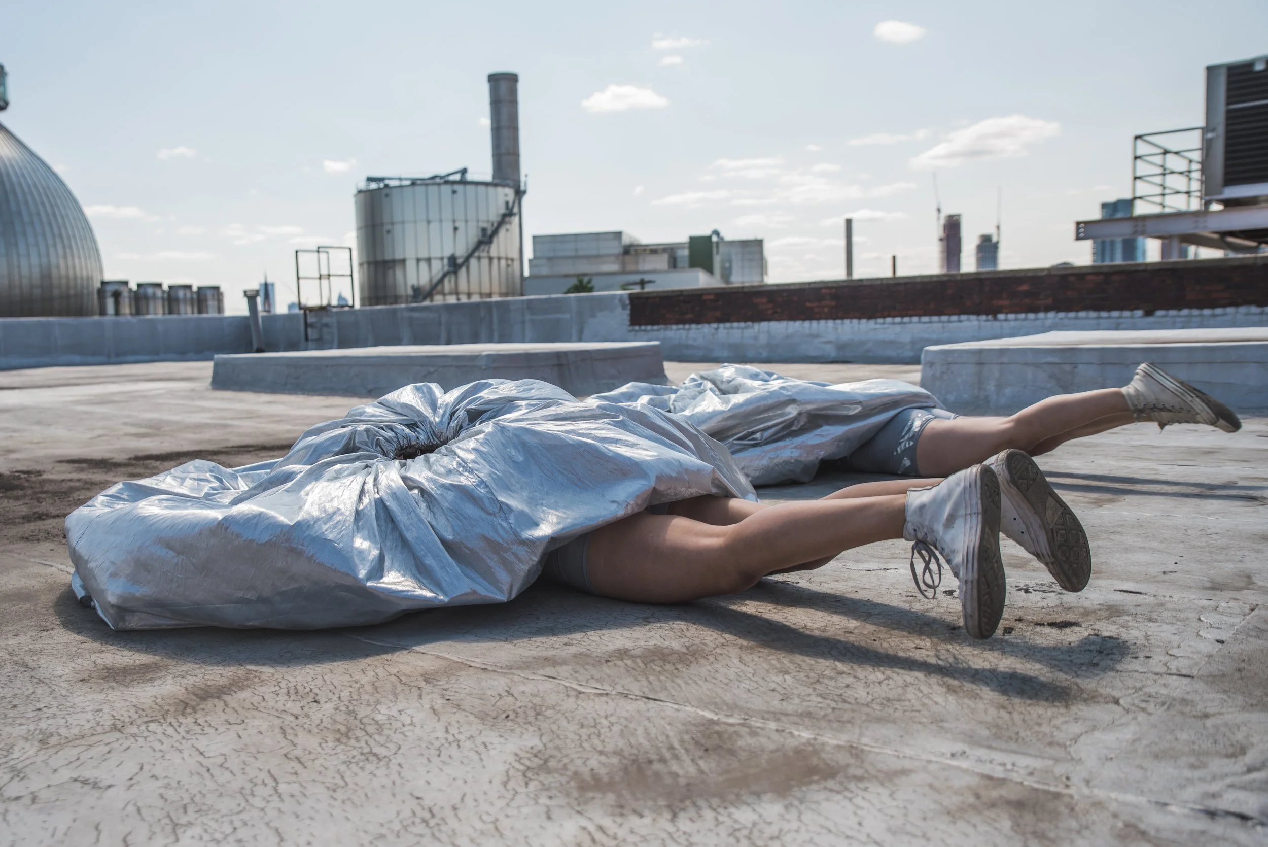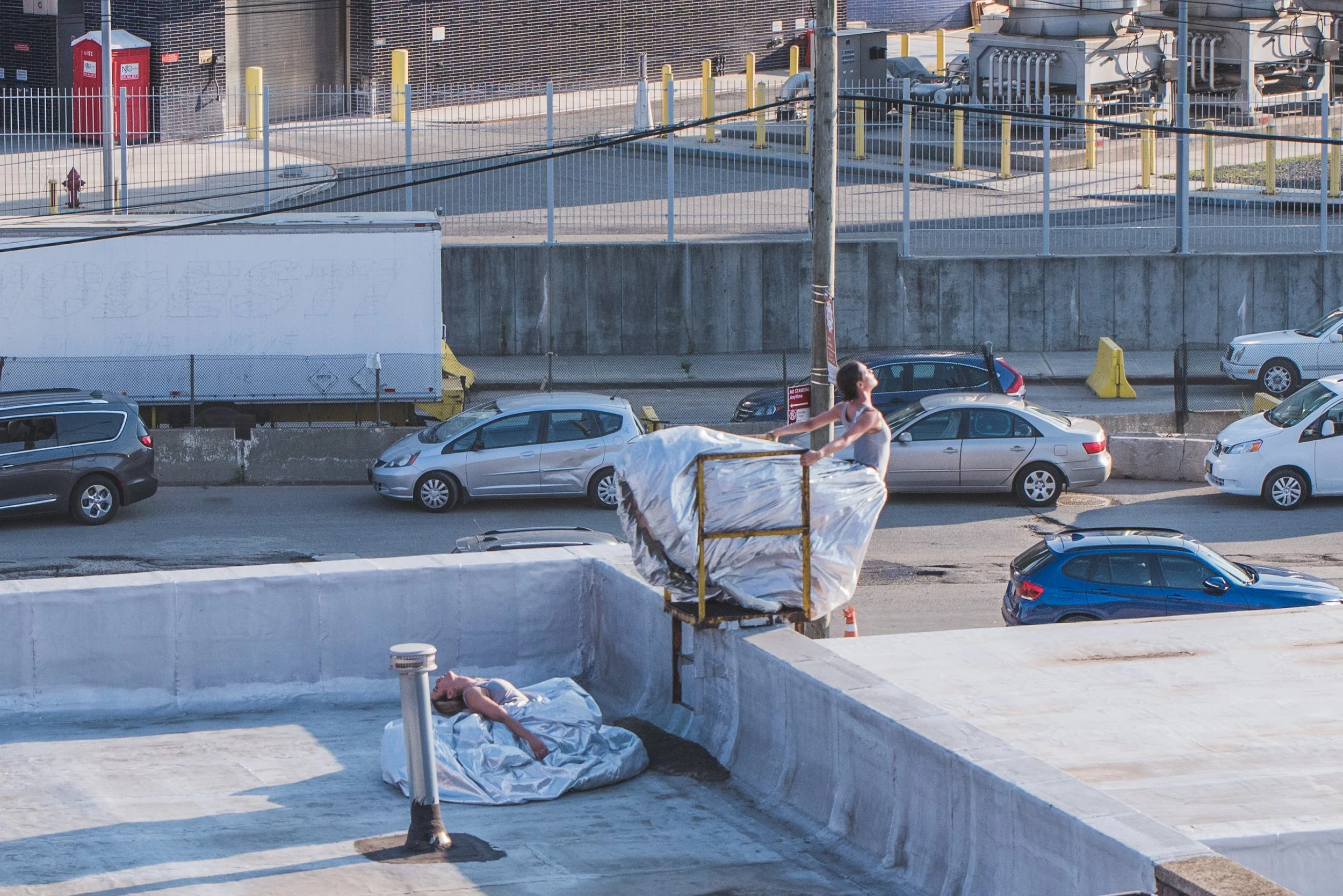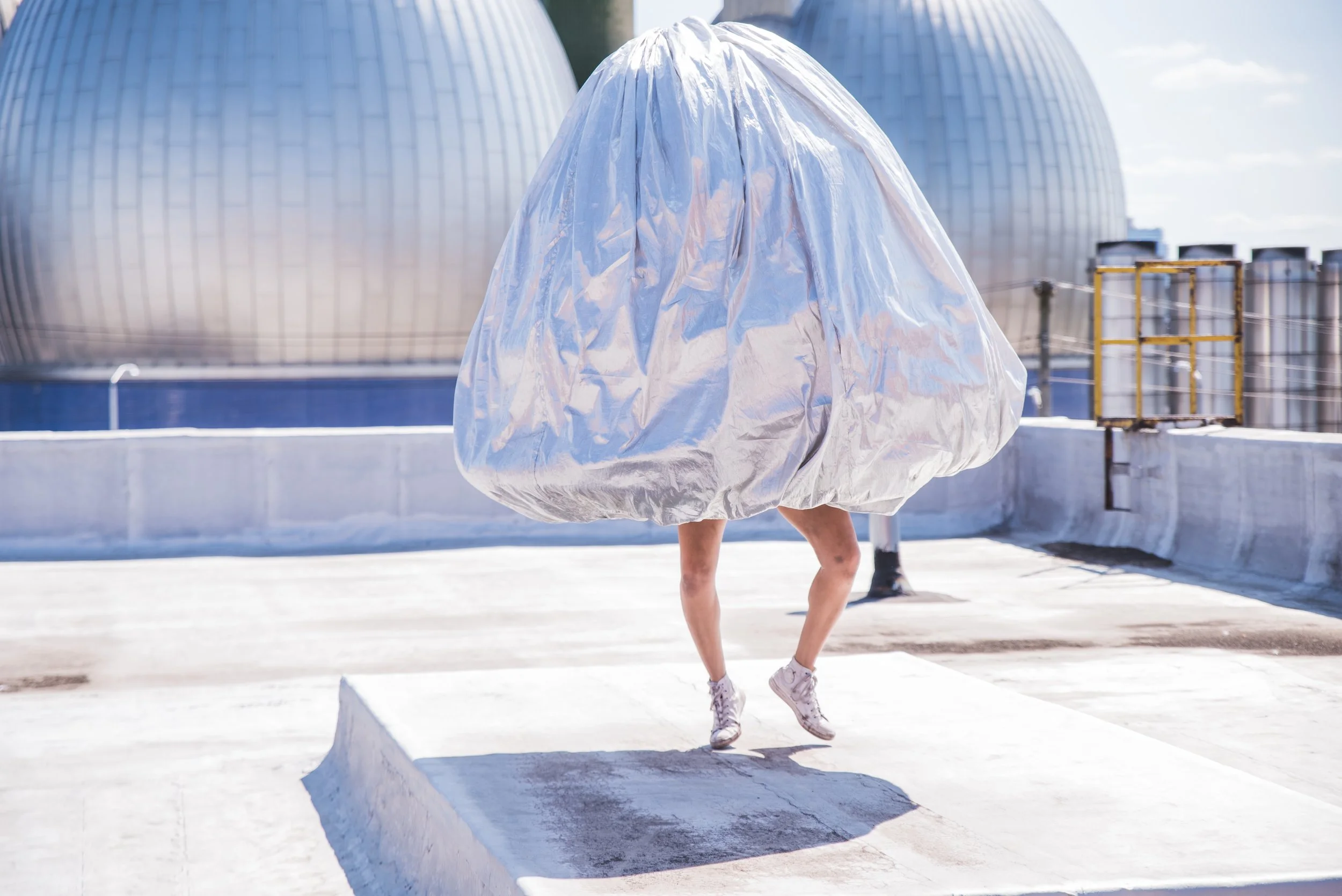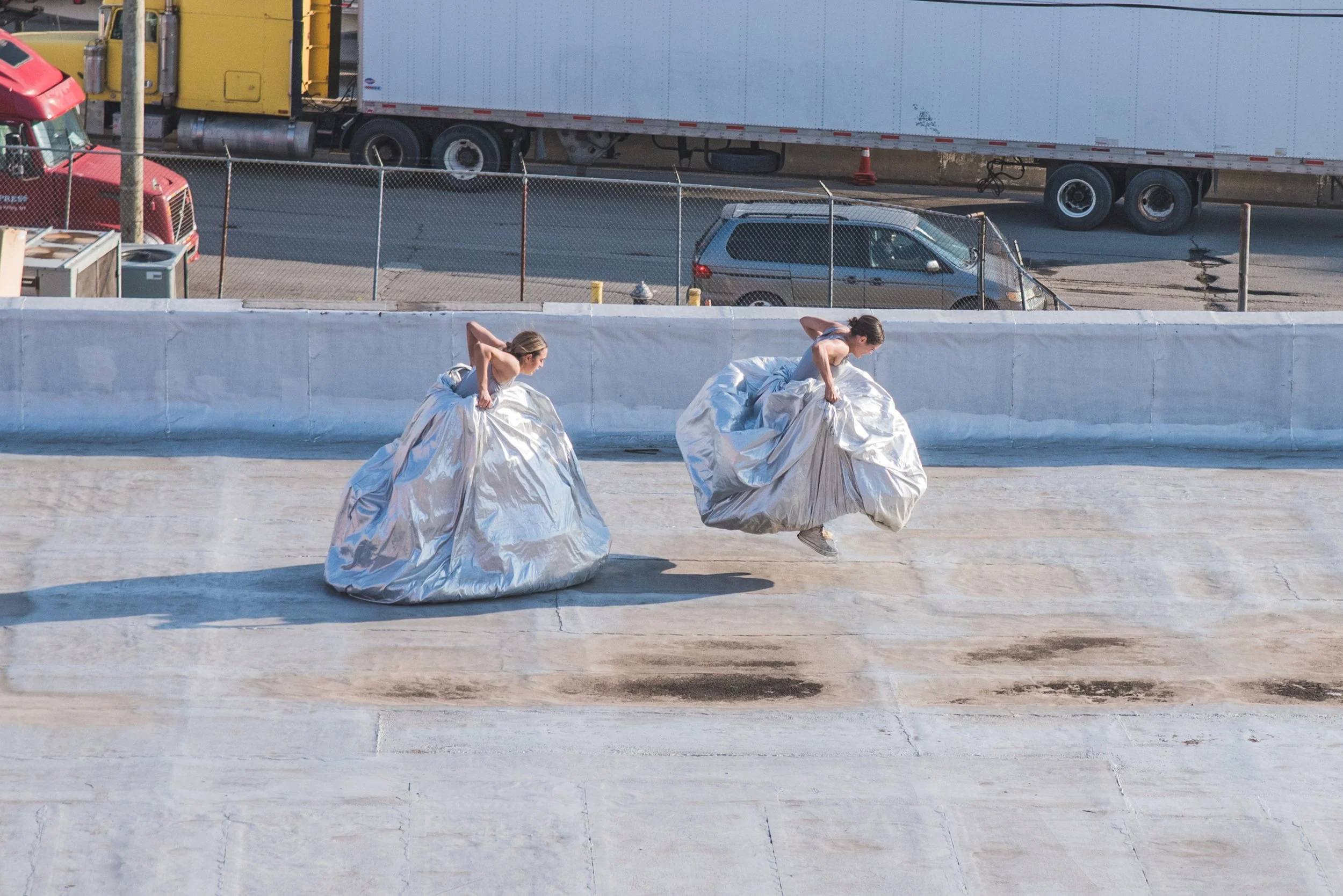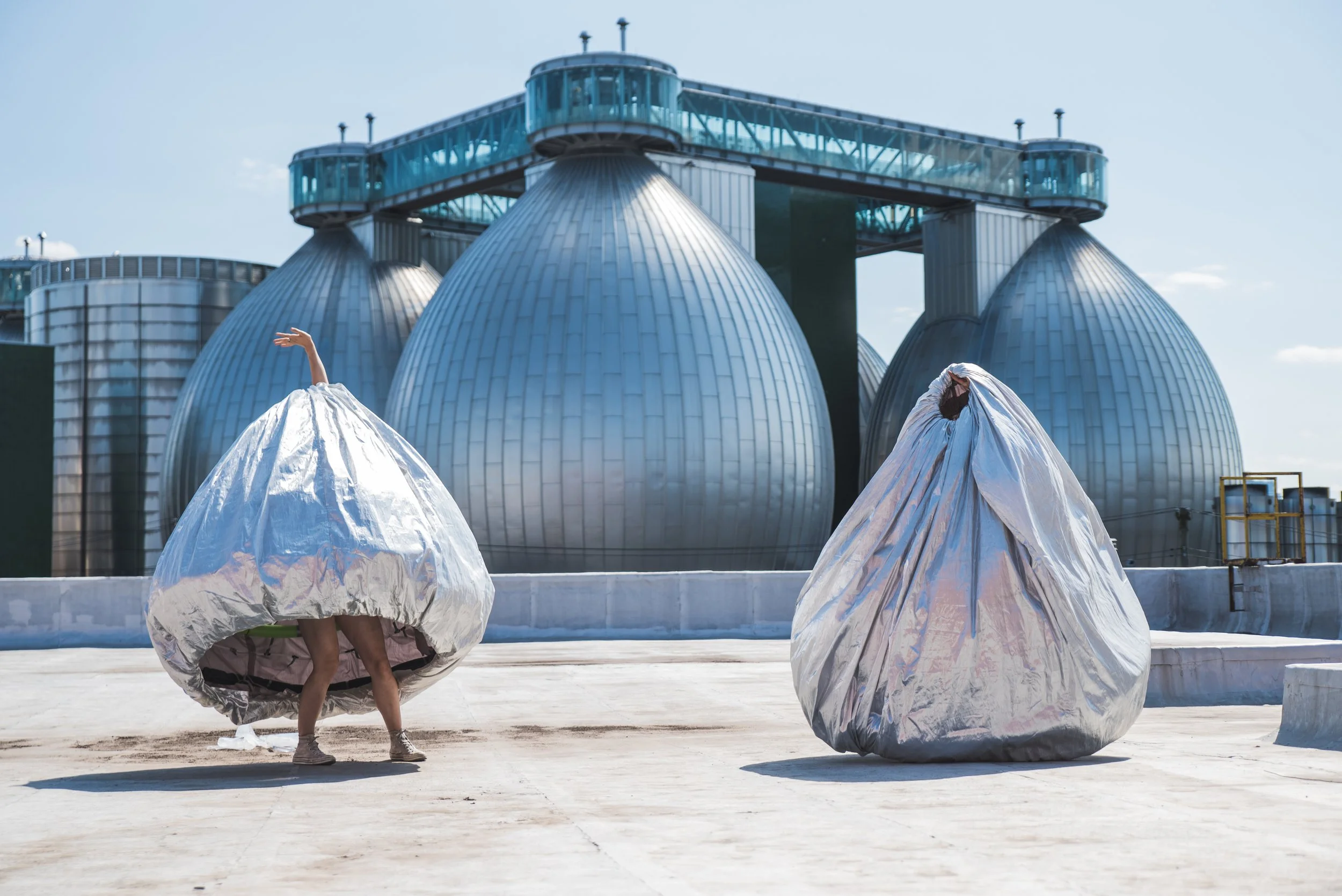 Jesture Eggs is a dance-theater production in which an absurd ever-changing duo slips in and out of gigantic silver skirts that anthropomorphize the Greenpoint digester eggs. While these steel tanks, also known as the “shit tits”, silently break down millions of gallons of Brooklyn sewage, the duo waltzes, shakes, lunges and shares secret handshakes in quick shifting scenes. Set to iconic film scores, the skirts morph from silver amebas to shimmering ball gowns, metallic rain ponchos to floating orbs, and ultimately, to two friends stumbling together through an oversized world of their own creation. Jesture Eggs is a love letter to classic cinema, a celebration of silly and a tender invitation to reimagine our relationships to each other and the cities we inhabit.